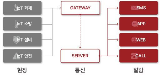 SafeMate 시스템은 화재 및 안전 이상 상황을 실시간으로 감지하고, 게이트웨이와 서버를 통해 관리자에게 SMS, 앱, 웹, 유선전화를 포함한 다양한 매체로 신속하게 알림을 전송합니다.