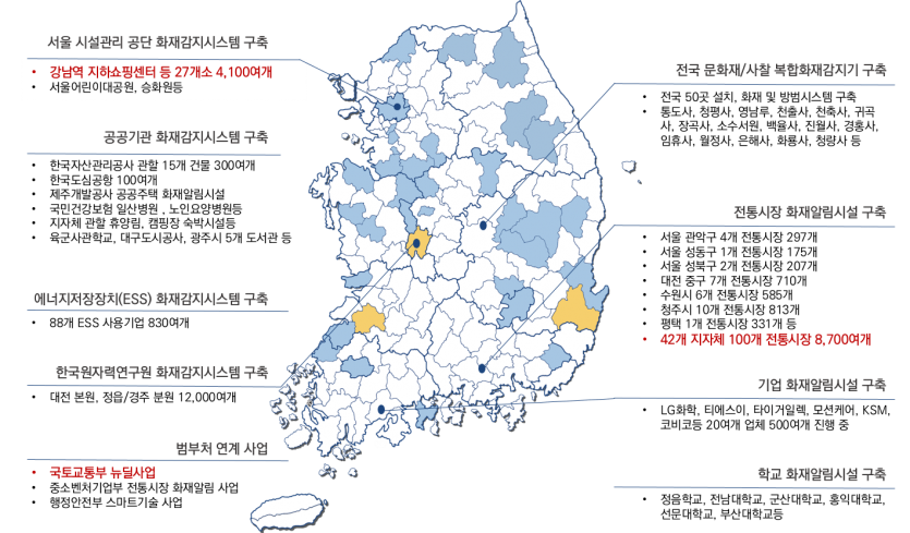 이미 15년 전에 IoT 기술을 기반으로 화재감지시스템을 보유한 엘디티 SafeMate는 약 50,000개의 화재감지기가 전국 전통시장, 한국원자력연구원, 서울지하상가, 전국문화재, 기업, 학교, ESS 등에 설치⋅운영 중이다.
