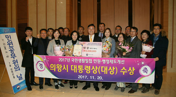 경기 의왕시는 국민생활밀접 행정·민원제도 우수사례 경진대회에서 행정분야 우수기관 대통령상을 수상했다고 21일 밝혔다. 행정안전부가 주관한 이번 대회는 정부와 지방자치단체가 참여해 민생을 개선할 수 있는 제도개선 사례를 발굴하고 성과를 공유하기 위해 해마다 개최하고 있다. 시는 ‘전통시장 스마트화재대응시스템 구축’ 사업으로 대통령상을 수상했다.